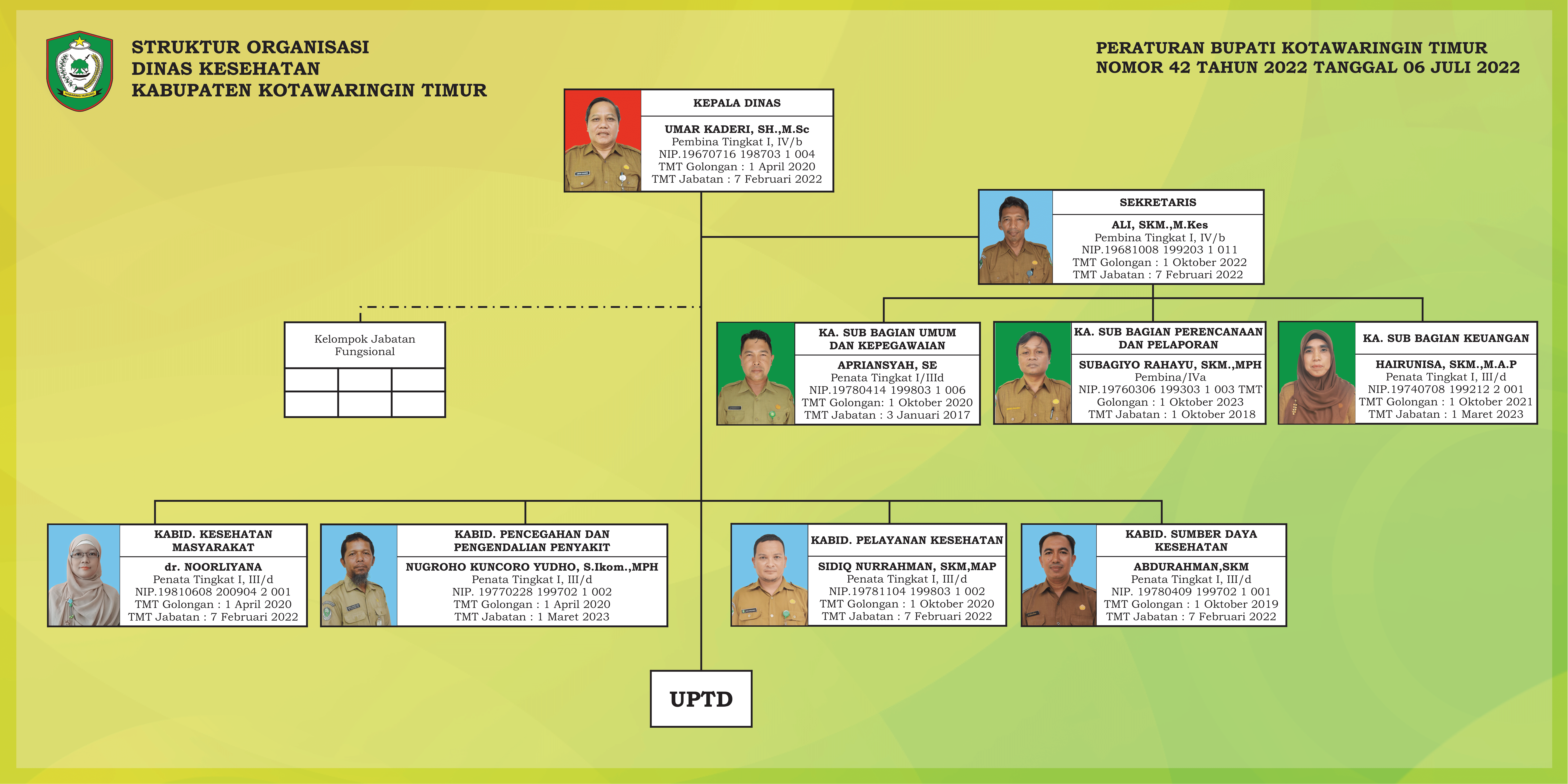 Berdasarkan peraturan tersebut, struktur organisasi Dinas Kesehatan Kabupaten Kotawaringin Timur yang berlaku saat ini adalah sebagai berikut: